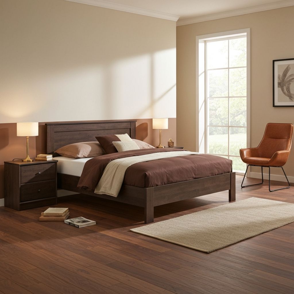 Gidas apie riešutmedžio, ąžuolo, kakavos ir kitų šiltų tonų derinimą skirtingose erdvėse.